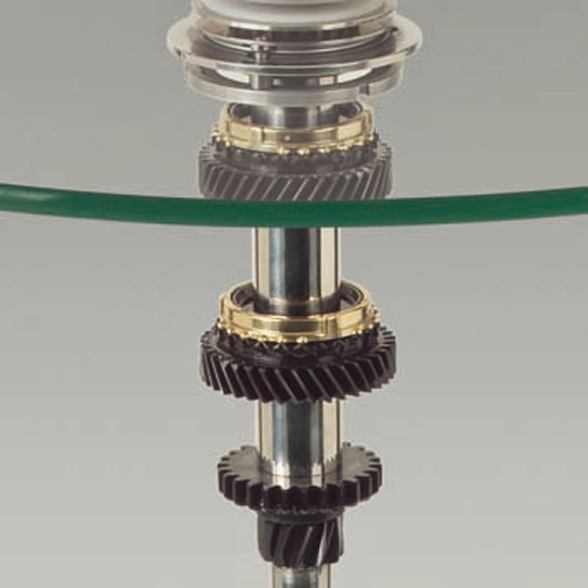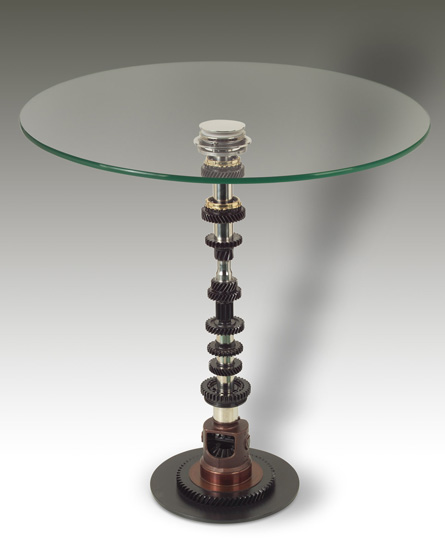 Mesa velador giratoria con transmisión y columna de piñones Renault, con cristal templado de 10 m/m de espesor y diámetro de 55x70 ctms. de altura.