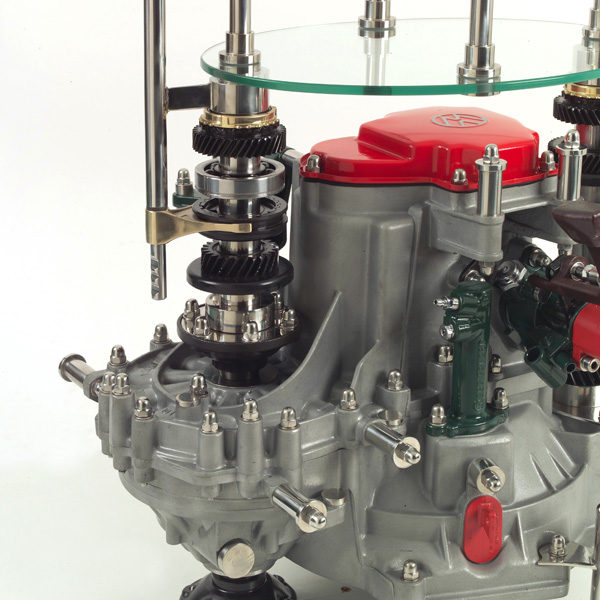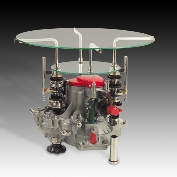 Mesa velador ovalada caja de cambios VOLKSWAGEN, columnas de piñones, con cristales templados de 8 mm. de espesor y estructura en inoxidable. Cristal superior de 80 x 58 x 70 cm. de altura. Peso conjunto de la obra 38 Kg.