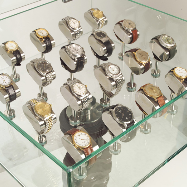 Mesa auxiliar Cigüeñal, con vitrina expositor para colección de relojes con capacidad para 20 unidades, con cristales templados de 10 y 8 mm. de espesor. Medidas vitrina 55 x 55 x 70 cm. de altura. Peso conjunto de la obra 53 Kg.