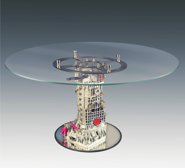 Mesa comedor y trabajo, caja de cambios larga RENAULT con cristal templado de 12 mm. de espesor, diámetro 150 x 75 cm. de altura. Peso conjunto de la obra (A ENVIAR)